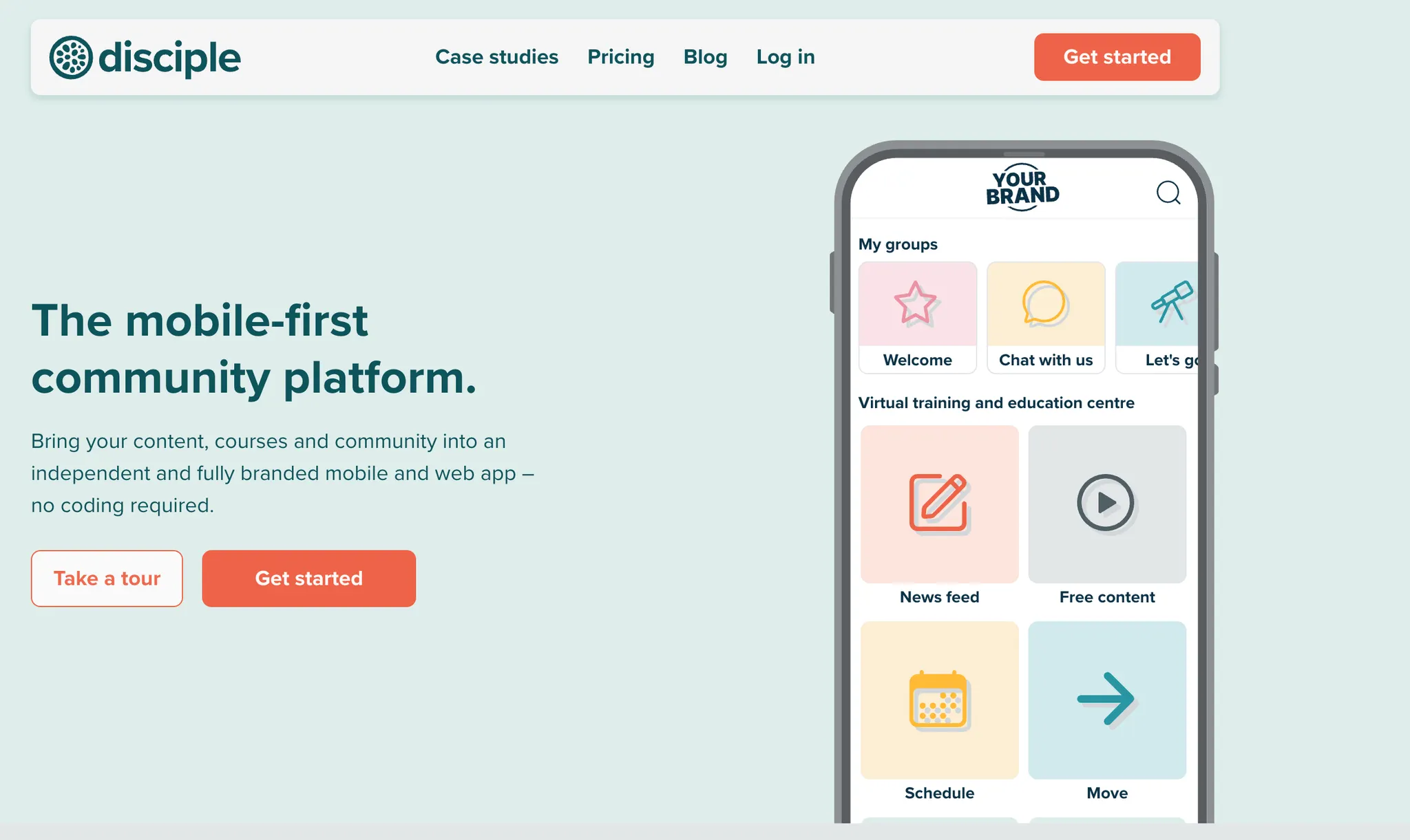 The platform includes social community features, content publishing, live streaming, events, and course hosting. Everything runs under your brand with no mention of Disciple anywhere. This gives you complete ownership of your community experience.