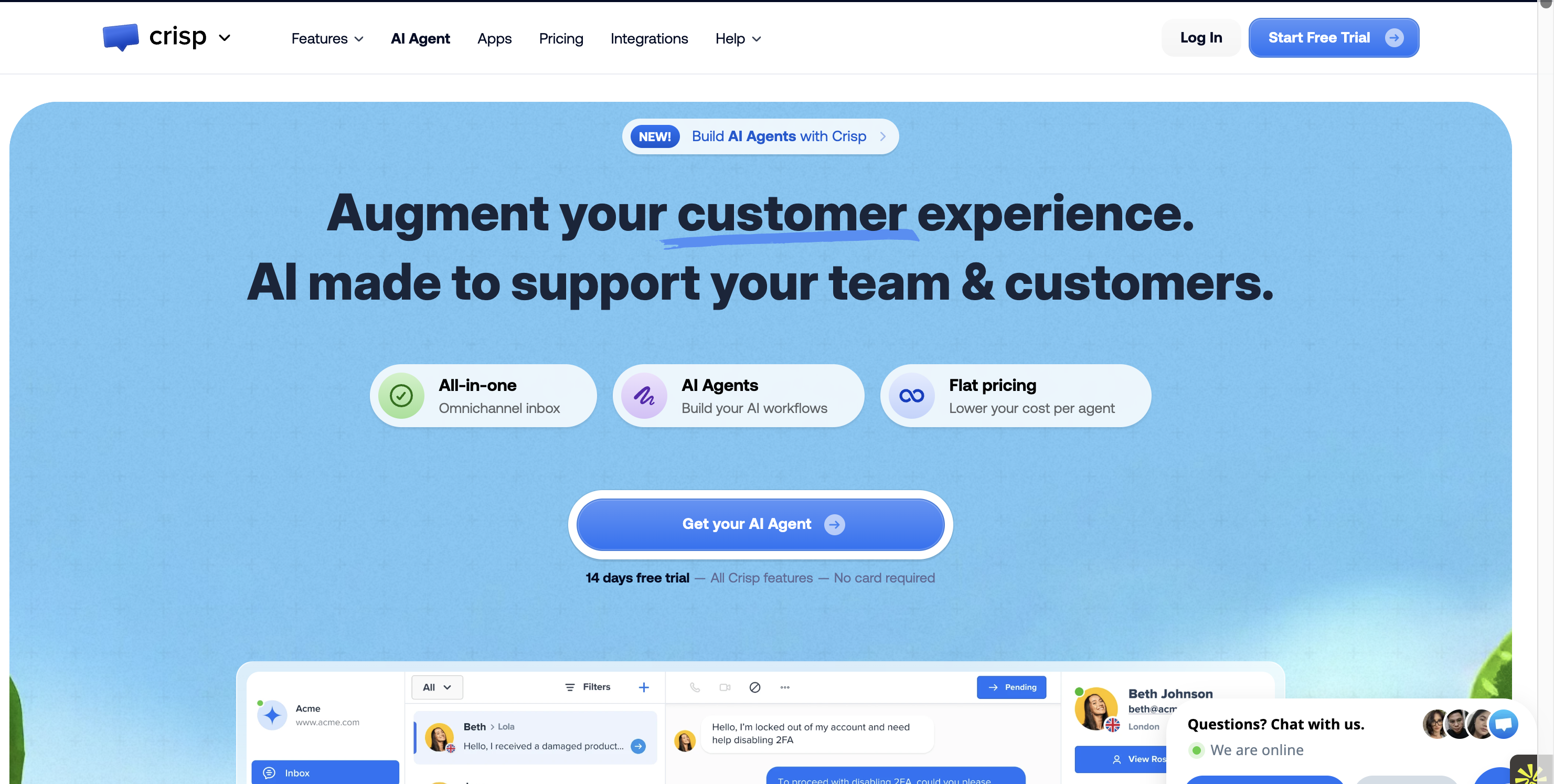 Crisp is a chat-first customer support platform that bundles live chat, shared inbox, knowledge base, and AI chatbot into a single workspace.