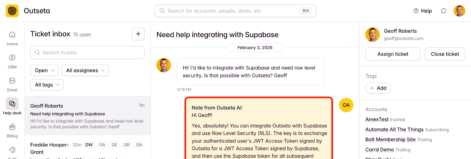 We don’t view AI chat as a replacement for human support. Frankly, much of the support that we get at Outseta is highly technical, nuanced, and human-centric support has become a differentiator for our business. If you want to submit a support ticket and talk to a human, you’ll always get a human response.