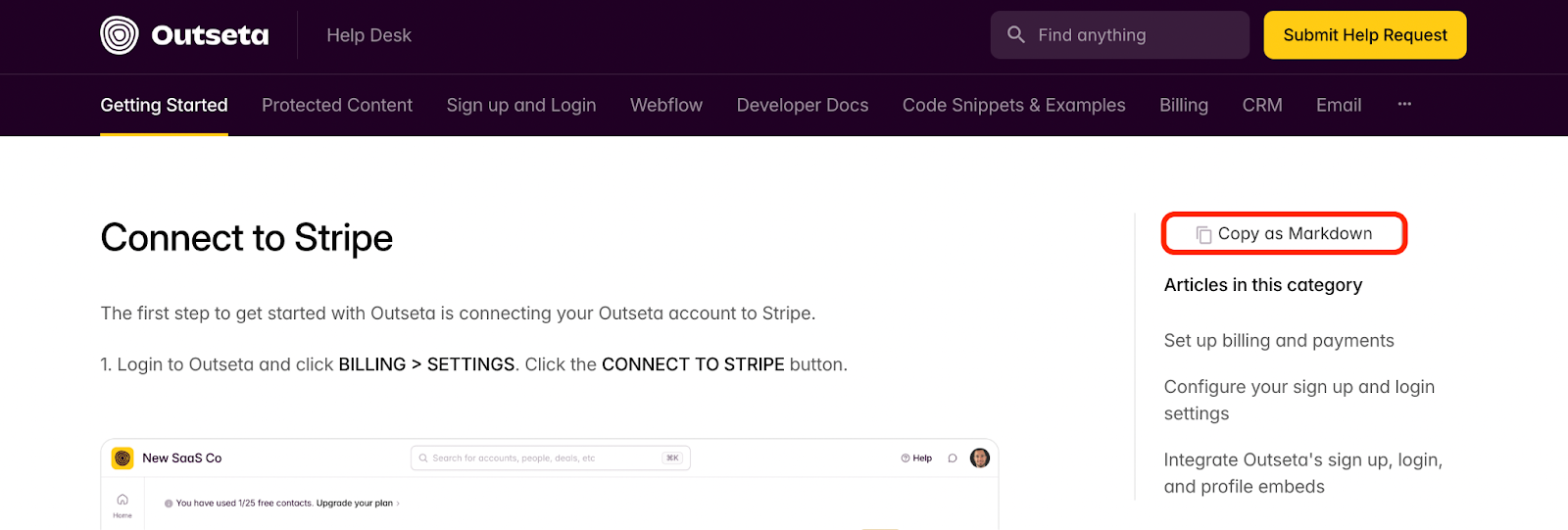 Next, we added a Copy as Markdown option to all of our documentation—the goal here was to make Outseta’s docs easier to ingest for LLMs and AI code editors.
