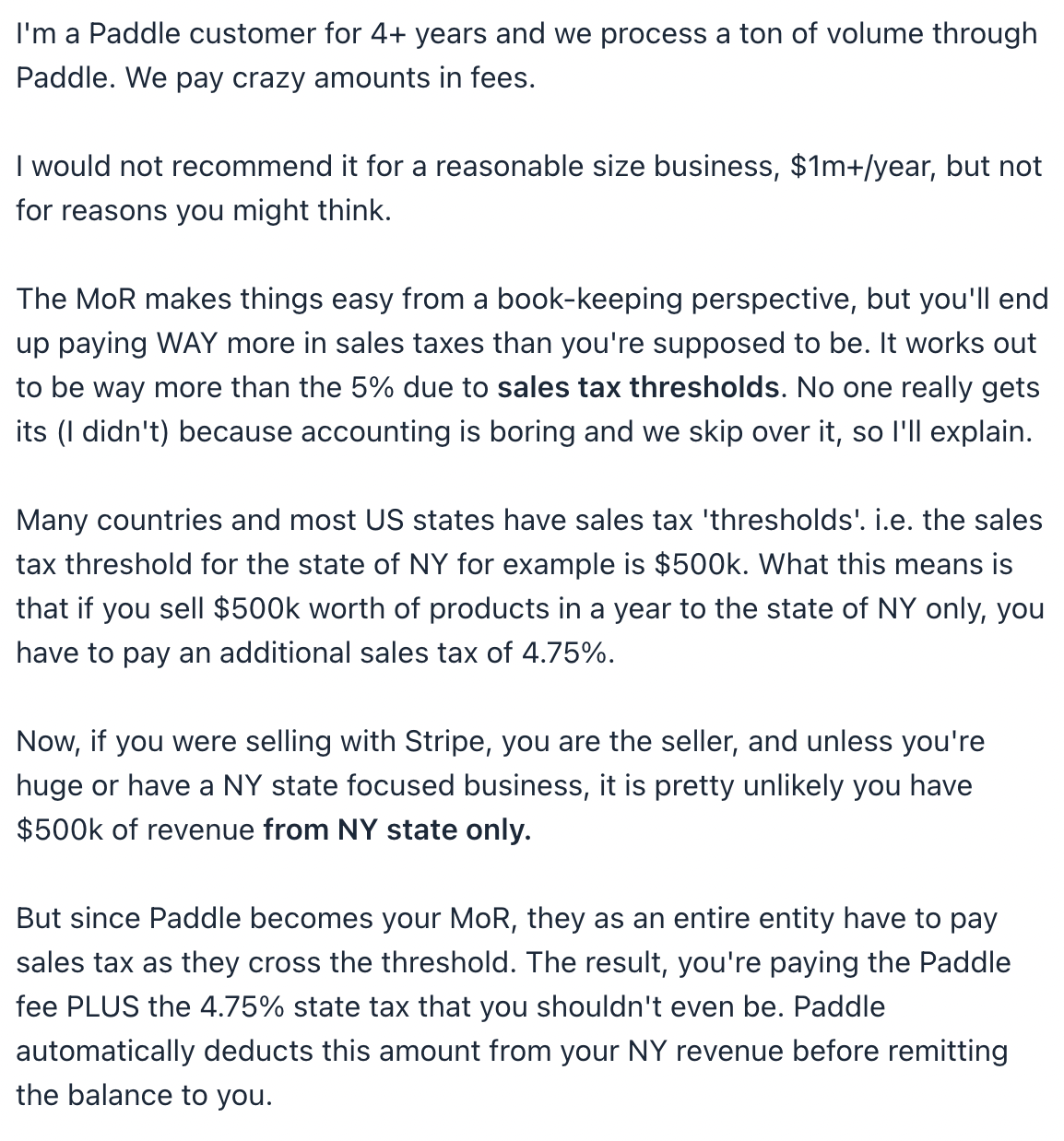 The point in all of this is that 5% becomes a 7%-14% fee very quickly in a lot of instances. It all depends on where and what you’re selling, but with a MoR you’re almost definitely paying the highest possible rates. The vast majority of SaaS CEO’s that I talked to who are above $1M in annual revenue and using a MoR expressed the same desire to eventually move away from the MoR.