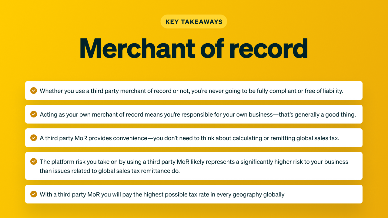 Higher fees aside, my conclusion is that you expose your business to substantially more risk by using a MoR than by handling global sales tax compliance yourself—even imperfectly.